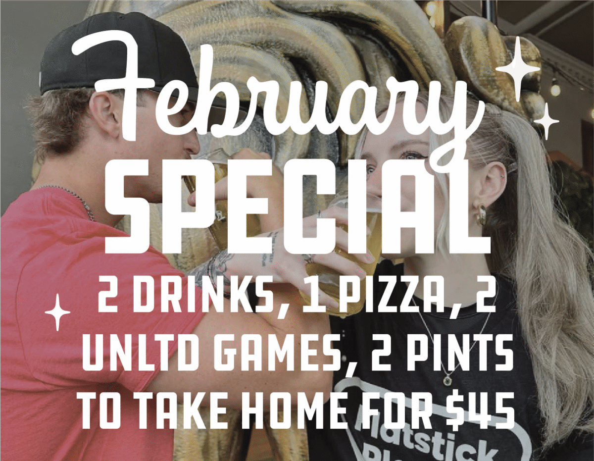 Through the month of February, come into the pub and take advantage of our special! Whether you’re here for Galentine’s gossip, need a first date icebreaker, bro-mance hangout, or a nice place to let them down easy, we’re here for it. Get 2 drinks, 1 pizza, 2 unlimited games, and 2 pint glasses to take home all for $45!